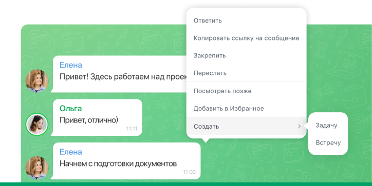 Они не потеряются в потоке сообщений — создавайте задачу или встречу прямо в чате
