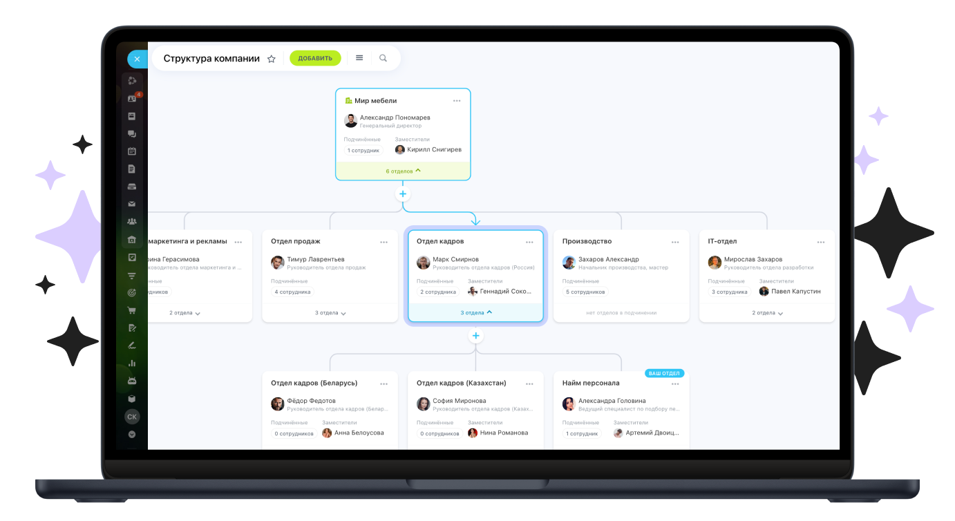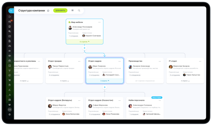Помогает настроить движение бизнес-процессов в компании: