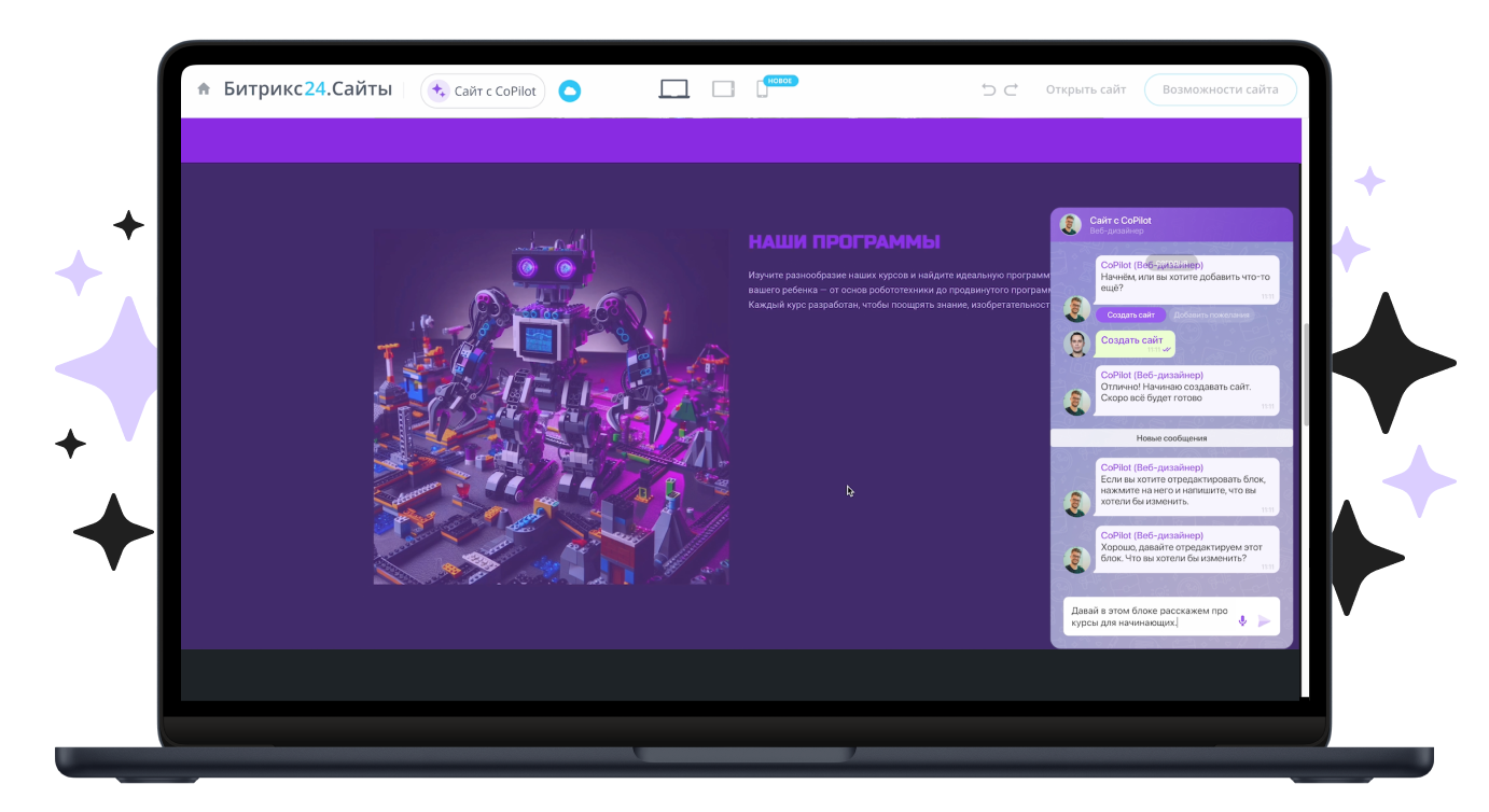 CoPilot сам создаст целый сайт, от вас нужно лишь минимальное описание. А все правки — тут же в чате с CoPilot в этой же вкладке