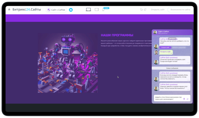 CoPilot сам создаст целый сайт, от вас нужно лишь минимальное описание. А все правки — тут же в чате с CoPilot в этой же вкладке